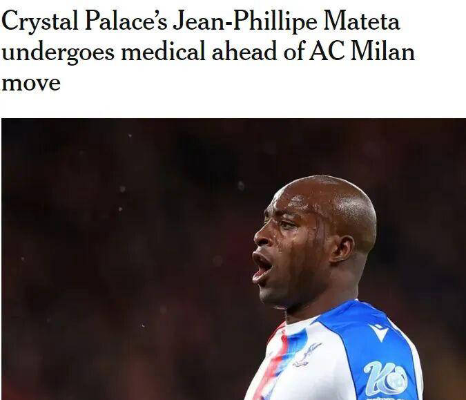 ตามรายงานล่าสุดจากนักข่าวของ Sky Sports เดวิด ออร์นสไตน์ ระบุว่า แพทริค มาเตต้า ได้เริ่มการตรวจร่างกายกับเอซี มิลานแล้ว โดยการย้ายทีมจากคริสตัล พาเลซไปยังรอสโซเนรีใกล้จะเสร็จสมบูรณ์ มิลานได้บรรลุข้อตกลงกับคริสตัล พาเลซในเรื่องค่าตัวที่เกิน 30 ล้านยูโรสำหรับกองหน้าวัย 28 ปีรายนี้ โดยข้อตกลงดังกล่าวถือว่าเสร็จสิ้นแล้วในขั้นพื้นฐานสกาย สปอร์ตส์ ได้ยืนยันรายงานเหล่านี้แล้ว อย่างไรก็ตาม ข้อมูลล่าสุดชี้ให้เห็นว่า เอซี มิลาน มีความลังเลในการไล่ล่าตัว มาเตตา ในช่วงตลาดซื้อขายนักเตะฤดูหนาวนี้ เนื่องจาก เอ็นคูนคู ได้แถลงอย่างชัดเจนว่าไม่ต้องการย้ายทีม ข้อมูลปัจจุบันบ่งชี้ว่าดีลนี้ได้หยุดชะงักลงแล้ว ลิเวอร์พูลเคยแสดงความสนใจมาก่อน และอาจมีการเจรจาอีกครั้งในช่วงตลาดซื้อขายนักเตะฤดูร้อน