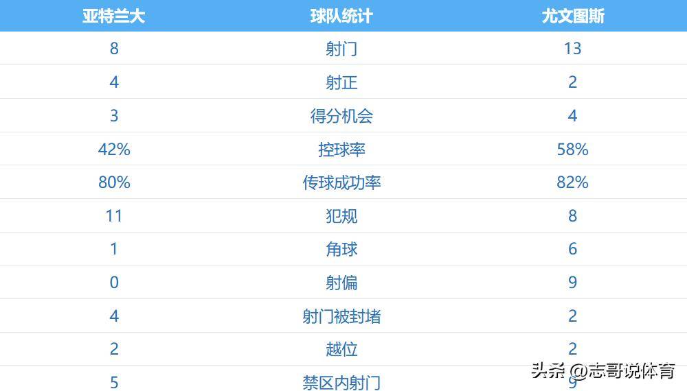 เมื่อพิจารณาสถิติการแข่งขันโดยรวมแล้ว ถือว่าน่าสนใจไม่น้อย ยูเวนตุสครองบอลเกือบ 60% ยิงมากกว่าอตาลันต้า 13-8 ครั้ง แม้จะยิงตรงกรอบน้อยกว่าที่ 2-4 ครั้ง ในแง่ของโอกาสทำประตูที่ชัดเจน ยูเวนตุสก็ยังคงนำ 4-3 พวกเขาครองเกมในหลายด้านสำคัญ แต่กลับล้มเหลวอย่างน่าเหลือเชื่อในการทำประตูแม้แต่ลูกเดียว ส่งผลให้พ่ายแพ้อย่างย่อยยับและตกรอบไป ผลงานในนัดนี้ของพวกเขานั้นชวนให้งุนงงไม่น้อย