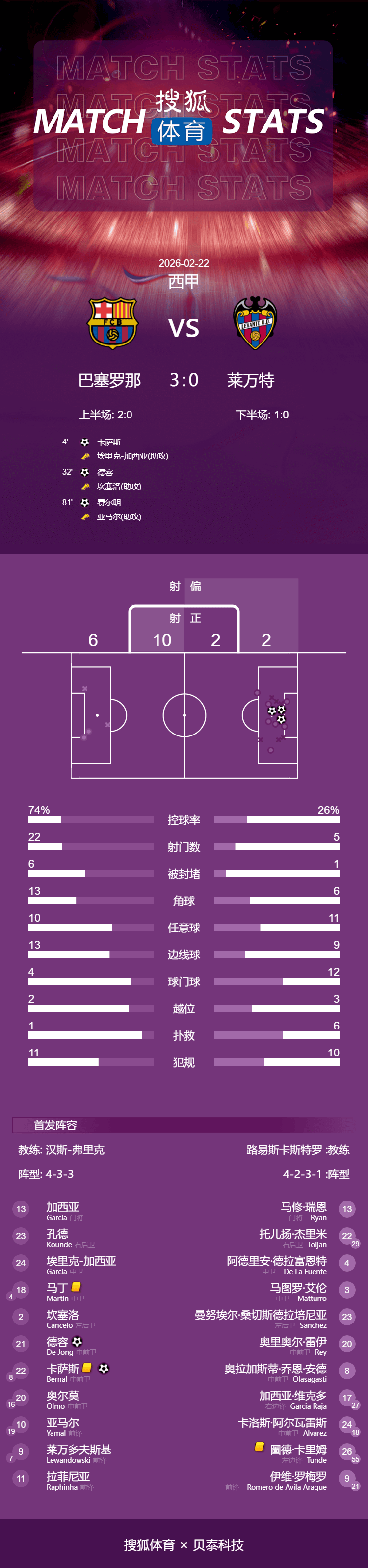 เวลา 23:15 น. ตามเวลาปักกิ่ง วันที่ 22 กุมภาพันธ์ บาร์เซโลนาเป็นเจ้าบ้านรับการมาเยือนของเลบันเต้ ในเกมการแข่งขันรอบที่ 25 ของลาลีกาในครึ่งแรก เบอร์นาร์ลเปิดสกอร์ด้วยการยิงประตูอย่างรวดเร็ว ตามมาด้วยเดอ ยองที่ขยายสกอร์ให้ทีมนำ บาร์เซโลนาเข้าสู่ช่วงพักครึ่งด้วยสกอร์ 2-0 หลังจากพักครึ่ง เฟร์มินปิดท้ายชัยชนะด้วยการยิงประตูที่สวยงาม ทำให้บาร์เซโลนาชนะ 3-0 ผลการแข่งขันนี้ทำให้พวกเขาหยุดสถิติแพ้รวดและแซงเรอัล มาดริดขึ้นครองตำแหน่งจ่าฝูงในลาลีกา