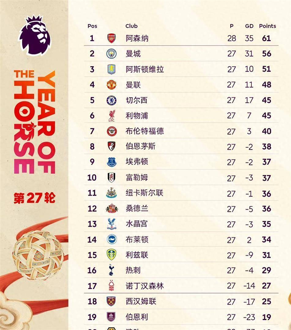ที่จุดสูงสุดของตารางคะแนน การแข่งขันชิงแชมป์ระหว่างอาร์เซนอลและแมนเชสเตอร์ซิตี้ได้เข้าสู่ช่วงที่ละเอียดอ่อนที่สุดแล้ว หลังจากจบการแข่งขันทั้งหมดในสัปดาห์ที่ 27 อาร์เซนอลครองตำแหน่งจ่าฝูงด้วยคะแนน 61 คะแนนจาก 28 นัด นำหน้าคู่แข่งอยู่ 5 คะแนน อย่างไรก็ตาม ความได้เปรียบ 5 คะแนนนี้ซ่อนตัวแปรสำคัญไว้: อาร์เซนอลลงเล่นมากกว่าซิตี้ 1 นัด แมนเชสเตอร์ ซิตี้ มี 56 คะแนนจาก 27 นัด โดยยังมีเกมในมืออีกหนึ่งนัด ซึ่งในทางทฤษฎีแล้วทำให้พวกเขามีพื้นที่ในการเคลื่อนไหวมากขึ้น สิ่งที่ทำให้การแข่งขันชิงแชมป์ยังคงน่าตื่นเต้นจนถึงวินาทีสุดท้ายคือความจริงที่ว่าทั้งสองทีมยังมีเกมพบกันโดยตรงเหลืออยู่อีกหนึ่งนัดในฤดูกาลนี้