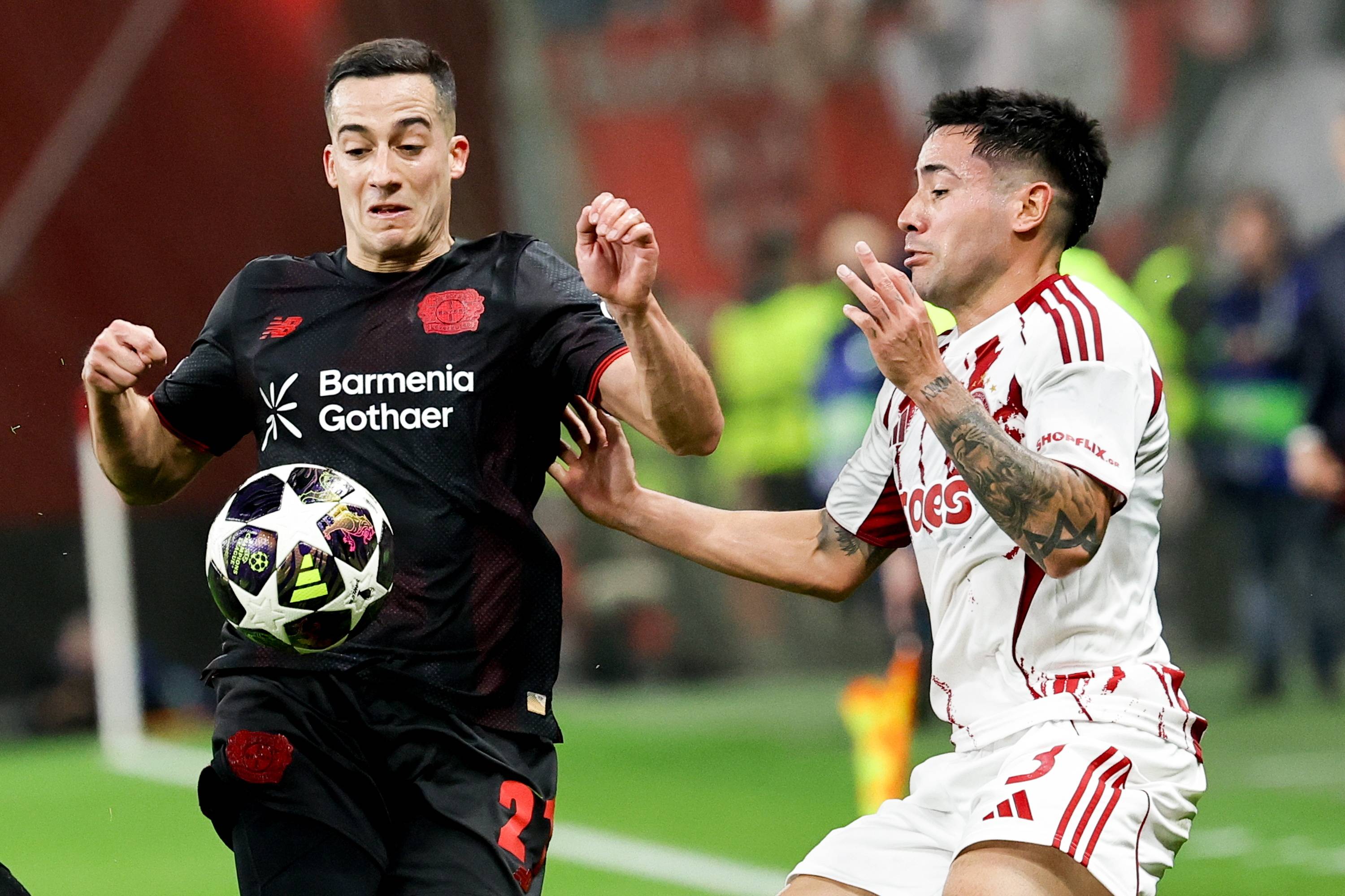 เมื่อวันที่ 24 กุมภาพันธ์ ลูคัส บาซเกซ (ซ้าย) ของไบเออร์ เลเวอร์คูเซ่น เข้าปะทะกับ ชิคินโญ่ ของโอลิมเปียกอส เพื่อแย่งบอล ชินหัว/EPA