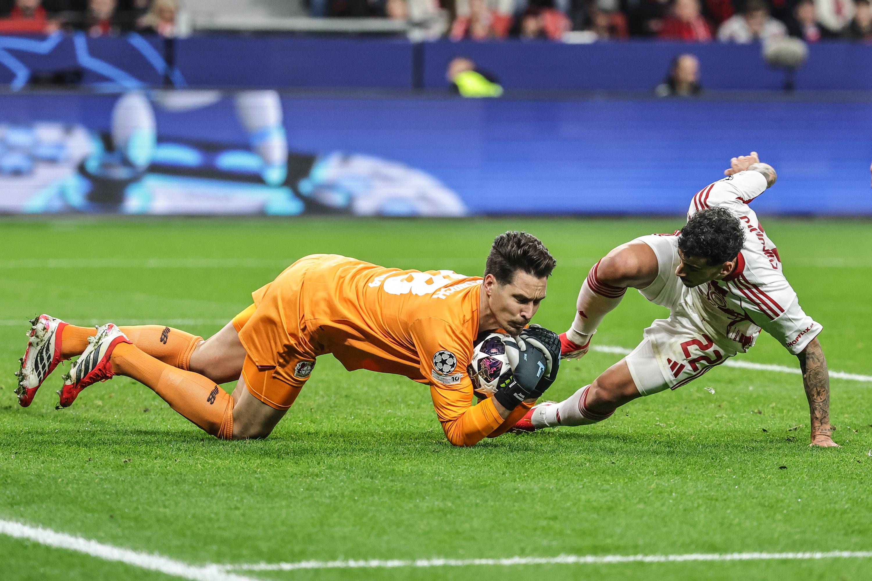 เมื่อวันที่ 24 กุมภาพันธ์ ผู้รักษาประตูของไบเออร์ เลเวอร์คูเซ่น บลาเซวิช (ซ้าย) เข้าปะทะกับผู้เล่นโอลิมเปียกอส ชิเกวinho. ซีนา/อีพีเอ