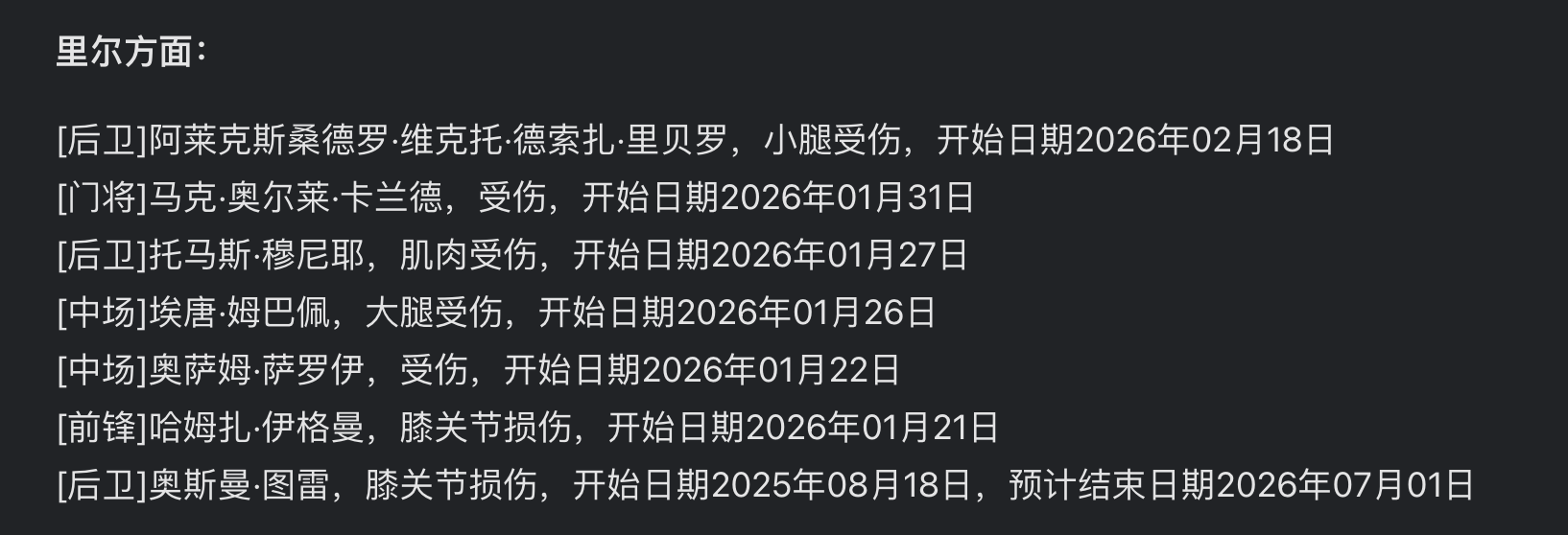 ลีลล์ต้องขาดผู้เล่นตัวจริงหรือผู้เล่นหมุนเวียนคนสำคัญมากถึงเจ็ดคนสำหรับการแข่งขันนัดนี้ โดยอาการบาดเจ็บมุ่งเป้าไปที่แกนหลักสามจุดของทีมอย่างแม่นยำ: อเล็กซ์ ซานโดร กองหลังตัวหลักต้องพักรักษาอาการบาดเจ็บที่น่อง; โธมัส เมอนิเยร์ แบ็กขวาคนสำคัญไม่สามารถลงสนามได้เนื่องจากอาการบาดเจ็บที่กล้ามเนื้อต้นขาด้านหลัง การขาดหายไปของผู้เล่นแนวรับคนสำคัญเหล่านี้ทำให้แนวรับของลีลล์และเกมรุกริมเส้นลดลงอย่างมากเอธาน เอ็มบัปเป้ กองกลางดาวรุ่งต้องพักรักษาอาการบาดเจ็บที่กล้ามเนื้อต้นขาด้านหลัง; ปีกความเร็วสูง วาห์บี คาซรี ได้รับบาดเจ็บที่ขาหนีบ; และมีรายงานว่า เบนตาลีบ, อังเดร และโกเมส ซึ่งเป็นสมาชิกสำคัญของสามกองกลางหลัก กำลังมีปัญหาเรื่องความฟิตในระดับที่แตกต่างกันไป ความแข็งแกร่งและความสร้างสรรค์ในแดนกลางของลีลล์แทบจะหายไปหมดสิ้น