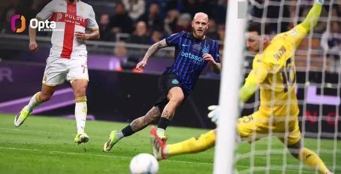 ในขณะเดียวกัน ที่มิลาน การแข่งขันระหว่างอินเตอร์กับเจนัวดำเนินไปอย่างตรงกันข้ามอย่างสิ้นเชิง แม้จะตกรอบแชมเปียนส์ลีกอย่างน่าผิดหวังในช่วงกลางสัปดาห์ แต่นีร์ร่าซูร์รี่ก็ไม่ได้แสดงสัญญาณของการลดความเหนือชั้นในลีกแต่อย่างใด เผชิญหน้ากับเจนัวที่คุมทีมโดยเด รอสซีและกำลังต่อสู้เพื่อความอยู่รอด อินเตอร์เข้าควบคุมเกมได้อย่างเด็ดขาดตั้งแต่เริ่มเกม ในนาทีที่ 27 ความพยายามยิงไกลของมคิทาร์ยานทำให้คานประตูสั่น สะท้อนให้เห็นว่าประตูกำลังจะเกิดขึ้นในไม่ช้า สี่นาทีต่อมา การประสานงานอันยอดเยี่ยมก็ส่งผลให้เกิดประตูขึ้นในที่สุด มิคิตาเรียนส่งบอลข้ามแนวรับอย่างเหนือชั้นจากนอกกรอบเขตโทษ แบ็คซ้ายดิมาร์โกอ่านเกมได้อย่างสมบูรณ์แบบ พุ่งทะยานไปข้างหน้าด้วยความเร็ว จากมุมแคบมากทางด้านซ้ายของกรอบเขตโทษ เขาแตะบอลด้วยด้านนอกของเท้าทันทีที่บอลยังไม่กระดอน ส่งบอลโค้งเข้าเสาไกลอย่างสวยงาม ประตูนี้สร้างความตื่นตาตื่นใจ แสดงให้เห็นถึงเทคนิคอันยอดเยี่ยมและพรสวรรค์ในการทำเกมรุกของดิมาร์โก