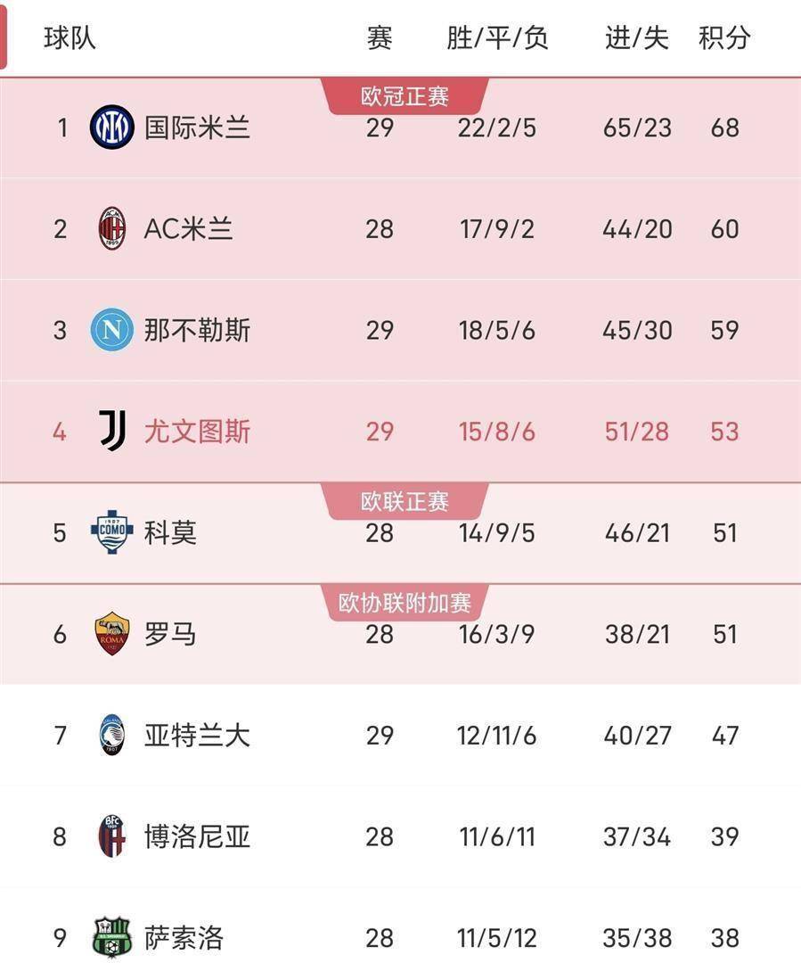 การเปลี่ยนแปลงครั้งใหญ่ที่สุดเกิดขึ้นในการแข่งขันเพื่ออันดับที่สี่ หลังจากยูเวนตุสชนะไป แต้มถึง 53 แต้ม ด้วยชัยชนะครั้งนี้ พวกเขาแซงหน้าโคโมและโรม่าในอันดับ ขึ้นสู่อันดับที่สี่ในลีกชั่วคราว และเข้าสู่พื้นที่แชมเปียนส์ลีก โคโมและโรมมีคะแนนรวม 51 คะแนน อันดับที่ห้าและหกตามลำดับ แอตแลนต้าดึง 47 แต้มหลังจากการจับฉลาก อันดับที่เจ็ด