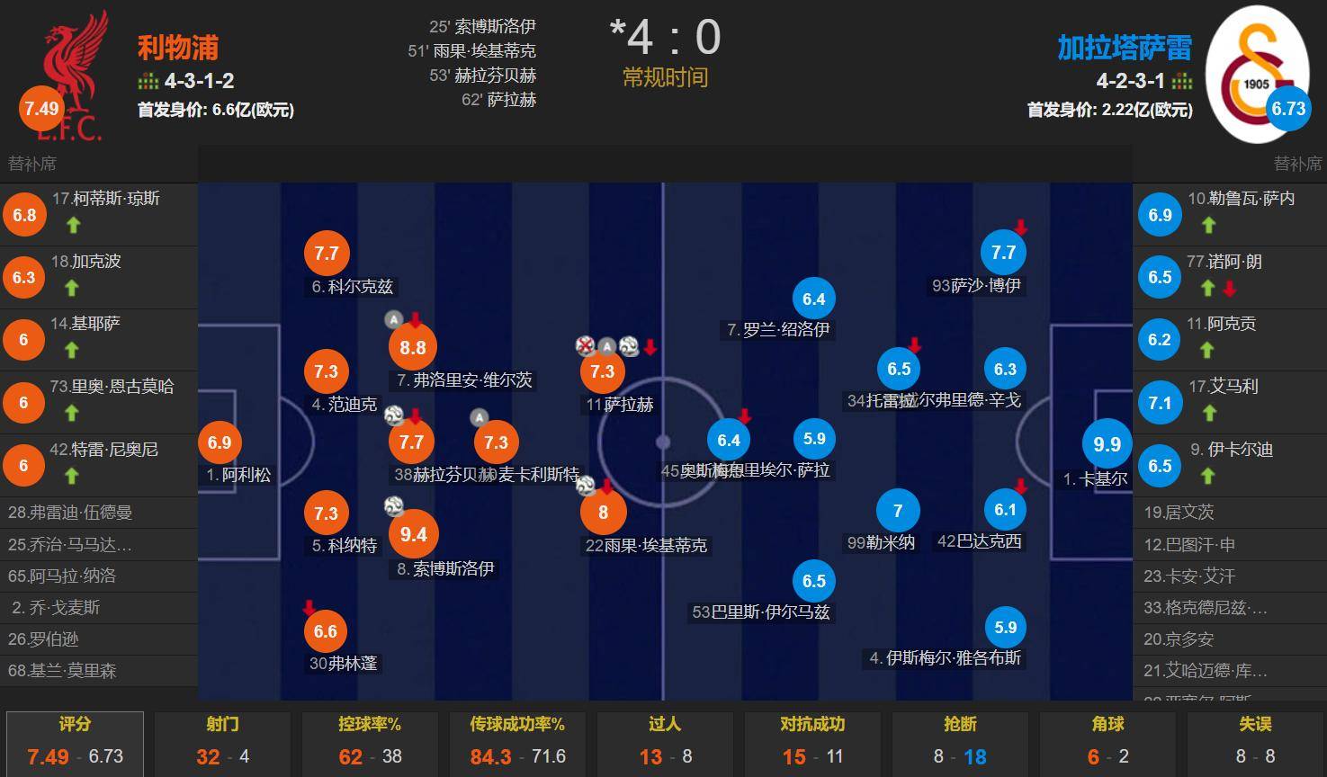 ในแคมเปญนี้ ลิเวอร์พูลยิงได้ 32 ฟุต โดยครึ่งหนึ่งเป็น 16 นัด หากไม่ใช่ให้ผู้รักษาประตูของกาลาตาซาเร่เล่นอย่างกล้าหาญ สูง และต่ำ และเขาชนะ 9 นัดหลังเกม ด้วยตัวชี้ 9 ตัว ลิเวอร์พูลได้ใช้กาลาตาซารายไปแล้ว