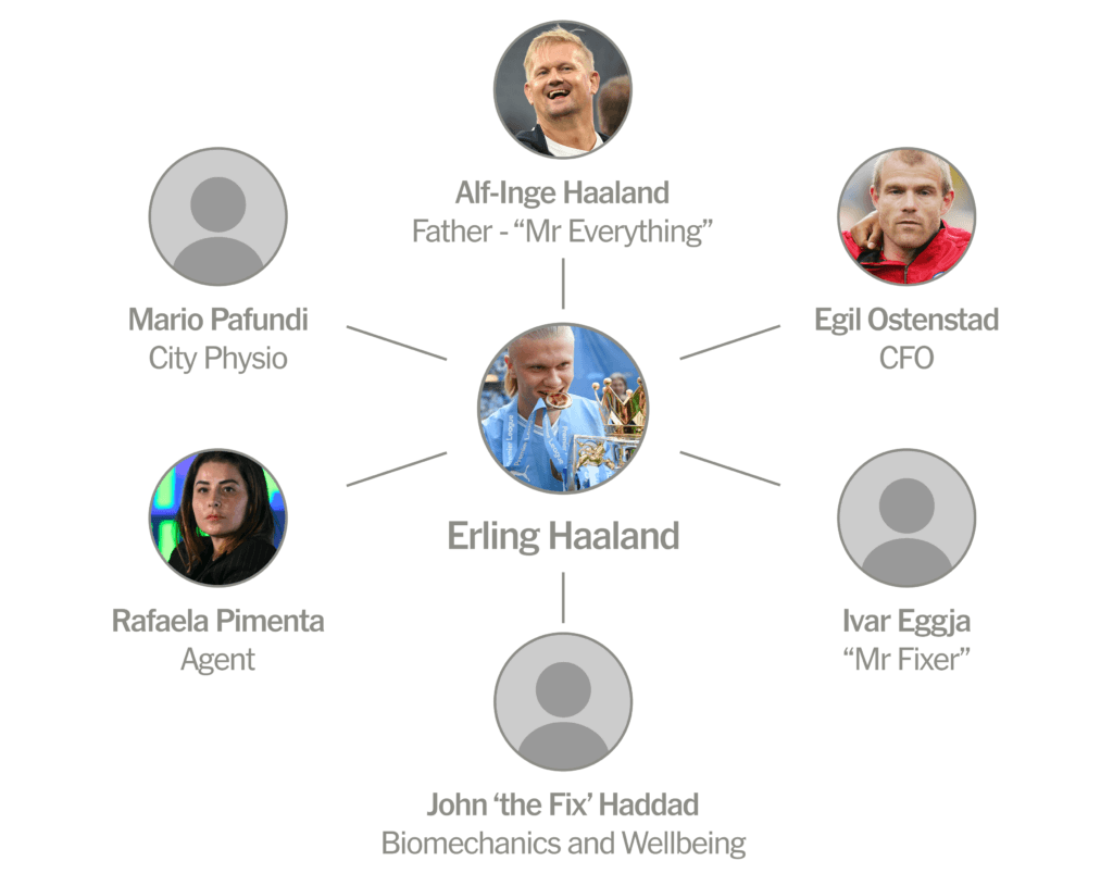 ในแง่ของการแข่งขันขั้นพื้นฐานที่สุด คุณพ่อ Alfie ได้บรรลุข้อตกลงที่ครอบคลุมกับ Laiola เมื่อลูกชายของเขาอายุ 10 ขวบ และวางแผนอย่างรอบคอบทุกย่างก้าวของอาชีพนักฟุตบอลของลูกชาย เขาและไลโอลาผู้ล่วงลับและพิเมนทูมผู้สืบทอดตำแหน่ง ทำให้ฮาร์แลนด์ย้ายทีมสี่ครั้งตลอดเวลาไปสู่จุดเริ่มต้นอาชีพที่ถูกต้อง เขาย้ายไปสวิตเซอร์แลนด์เพื่อหลีกเลี่ยงภาษีในช่วงฤดูร้อนปี 2023 แต่เขายังคงเป็น "แนวทาง" ที่สำคัญที่สุดของ Harland ในระดับการแข่งขันและจิตวิทยา ตลอดจนผู้มีอำนาจตัดสินใจในกิจการหลักทั้งหมด