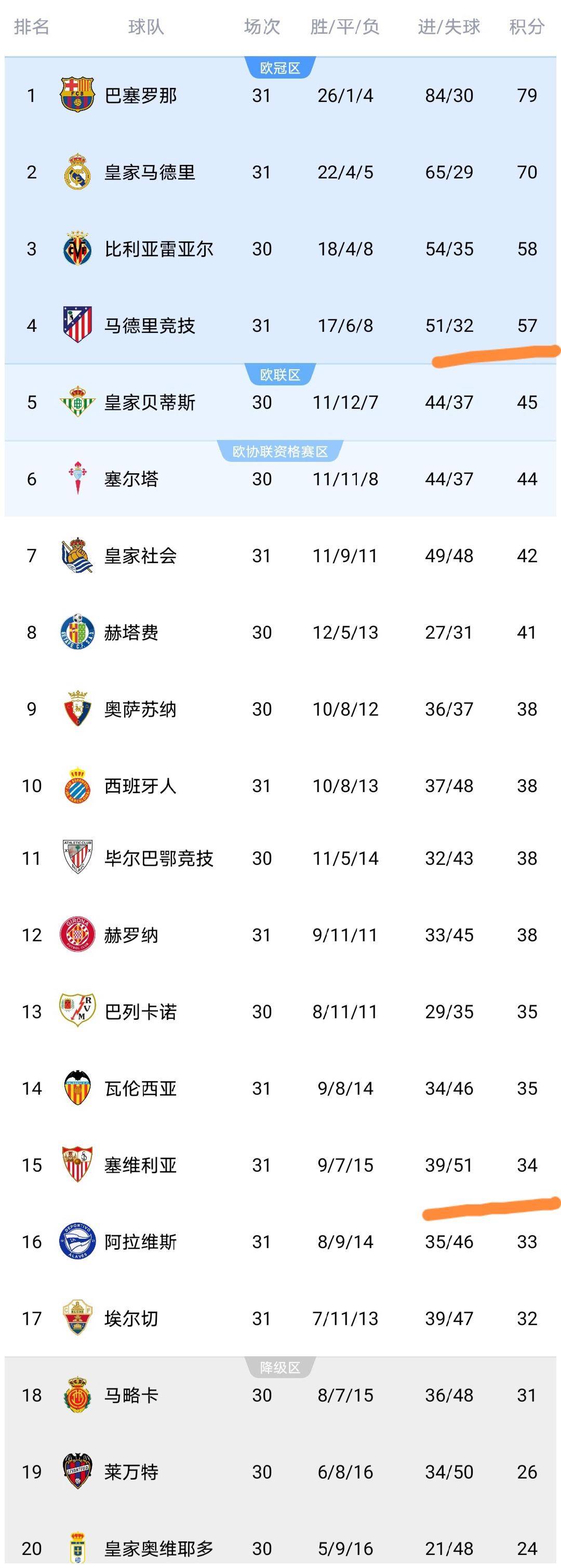 หลังจากสองเกม อันดับในลาลีกาก็ได้รับการเปลี่ยนแปลงเล็กน้อยเช่นกัน ด้วยชัยชนะอันแสนอบอุ่น บาร์เซโลนา นำอันดับด้วยคะแนน 9 แต้มอย่างมหาศาล โดยประกาศความปรารถนาอันแรงกล้าสำหรับแชมป์ลีก แม้ว่าแอตเลติโก มาดริดจะแพ้ในเกมเยือน แต่พวกเขายังคงนำรอยัล เบติส อันดับที่ 5 ไปมากถึง 12 แต้ม โดยครองความได้เปรียบอย่างแท้จริงในการผ่านเข้ารอบแชมเปี้ยนส์ลีก ผลลัพธ์ของสองเกมนี้ไม่ต้องสงสัยเลยเพิ่มความสงสัยและไฮไลท์ให้กับแนวโน้มสุดท้ายของลีกลาลีกาในฤดูกาลนี้