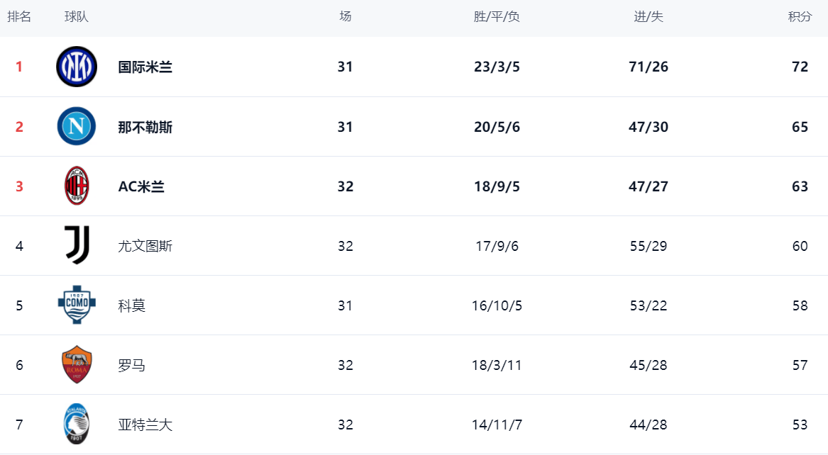 ในอันดับ อินเตอร์ มิลาน นำหน้า อันดับหนึ่งด้วยคะแนน 72 แต้ม และสถิติคือ 23 ชัยชนะ เสมอ 3 แพ้ 5 นาโปลีรั้งอันดับสองด้วยคะแนน 65 แต้มตามหลัง 7 แต้ม และมันเป็นเรื่องยากมากที่จะแข่งขันเพื่อชิงแชมป์ เอซี มิลาน แพ้ 63 แต้ม อันดับสาม เอซี มิลาน เป็นหนึ่งในทีมเต็งที่จะคว้าแชมป์ เนื่องจากการสูญเสียคะแนนบ่อยครั้งเมื่อเร็ว ๆ นี้สถานการณ์ของการแข่งขันชิงแชมป์ได้แย่ลงและตอนนี้แชมป์เปี้ยนชิพก็หายไป ยูเวนตุส อันดับที่ 4 ด้วยคะแนน 60 คะแนน ที่ห้าคือ Cuomo ซึ่งทำคะแนนได้ 58 คะแนน โคโมบิ ยูเวนตุส เล่นน้อยลง 1 ตัว และยังมีความหวังที่จะแซงยูเวนตุส โรมอยู่ในอันดับที่ 6 ด้วยคะแนน 57