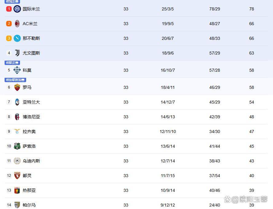 เอซี มิลาน ทำคะแนนได้ 66 แต้มจากชัยชนะของเขากับเวโรน่า (จากรายงานการสู้รบล่าสุด มิลานน่าจะมี 66 แต้ม แต่ข้อมูลก่อนหน้านี้แสดงให้เห็น 63 คะแนน ซึ่งอยู่ภายใต้การค้นหาล่าสุด นั่นคือ คะแนนของมิลานจะได้รับการอัปเดตหลังจาก 1-0) ซึ่งรวมตำแหน่งที่สาม ยูเวนตุส ชนะ 2-0 หลังชนะ 2-0 รั้งอันดับสี่ ข้างหลังพวกเขา Como และ Rome 58 คะแนนเท่ากันอยู่ในอันดับที่ห้าและหกตามลำดับ กลับมาอีกทีก็คือแอตแลนต้าซึ่งมีคะแนน 54 คะแนน