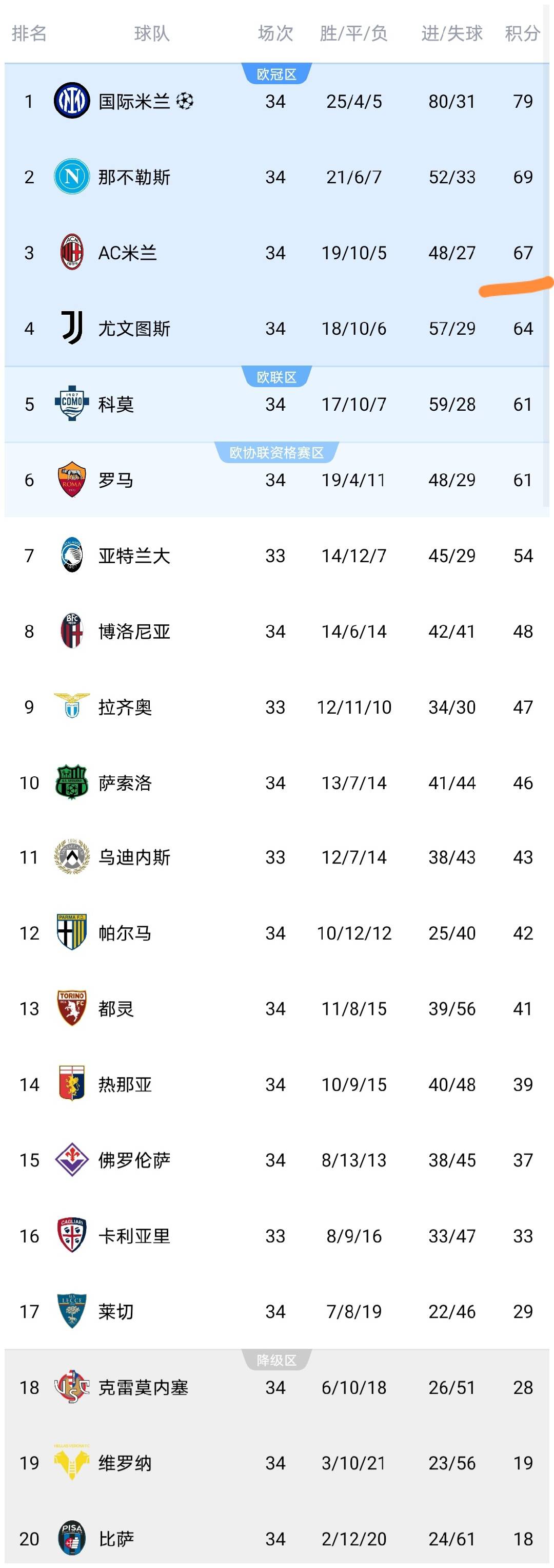 จะเห็นได้ว่าอินเตอร์ มิลาน นำ 79 แต้ม, เนเปิลส์ที่ 2 ด้วยคะแนน 69 แต้ม, ที่สามที่เอซี มิลาน 67 แต้ม และที่ 4 ด้วย 64 แต้มในยูเวนตุส