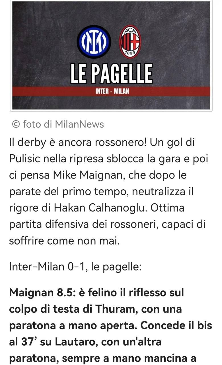 เซเรีย อา: มิลานเอาชนะอินเตอร์ 1-0; คะแนนผู้เล่นหลังการแข่งขัน: ไมญ็อง 8.5 (MVP), กองหลัง, พูลิซิช, ทูราม