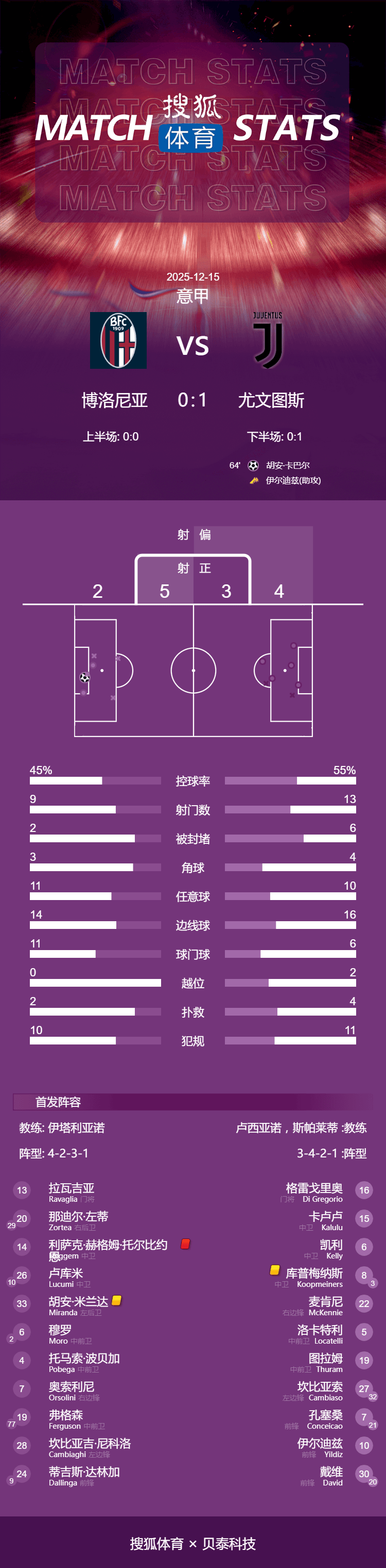 เวลา 03:45 น. ตามเวลาปักกิ่ง วันที่ 15 ธันวาคม โบโลญญาเป็นเจ้าบ้านรับการมาเยือนของยูเวนตุส ในรอบที่ 15 ของเซเรียอาในครึ่งแรก ทั้งสองทีมพยายามยิงประตูหลายครั้งแต่ไม่สามารถทำประตูได้ หลังจากพักครึ่ง ยูเวนตุสขึ้นนำจากการโหม่งของฮวน กาบาเยโร่ ขณะที่กองหลังโบโลญญ่า ทอร์บียอร์น ถูกไล่ออกจากสนาม สุดท้ายยูเวนตุสคว้าชัยชนะเหนือโบโลญญ่าไปอย่างหวุดหวิด 1-0