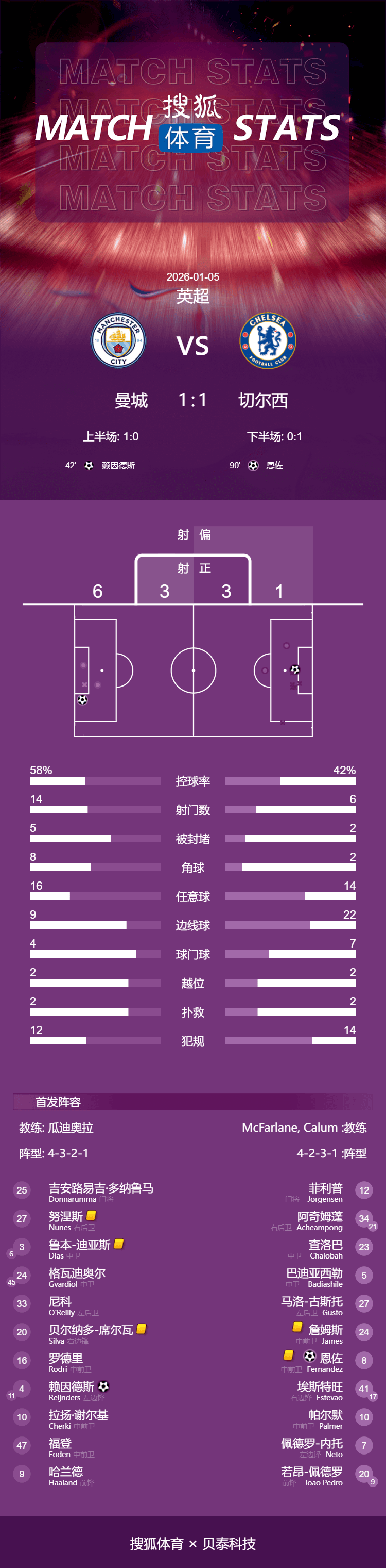 เวลา 01:30 น. ของวันที่ 5 มกราคม 2026 การแข่งขันพรีเมียร์ลีกนัดที่ 20 มีการแข่งขันคู่ใหญ่ที่แมนเชสเตอร์ ซิตี้ เปิดบ้านต้อนรับการมาเยือนของเชลซีในครึ่งแรก เออร์ลิ่ง ฮาแลนด์ ยิงโค้งไปชนเสาและกระเด้งออกมา จากนั้น เลอันเดอร์ เดมเบเล่ ทำลายความเงียบด้วยการยิงอย่างรุนแรง ใกล้จะหมดเวลาบาดเจ็บที่อีกฝั่ง เอนโซ เฟอร์มาโอ ตีเสมอจากระยะใกล้ สุดท้าย แมนเชสเตอร์ ซิตี้ เสมอกับ เชลซี 1-1 ที่บ้าน ทำให้พวกเขาเสมอสองนัดติดต่อกัน ขณะที่เชลซีต้องทนกับการไม่ชนะเป็นนัดที่สี่ หลังจากผลการแข่งขันนี้ แมนเชสเตอร์ ซิตี้ ตามหลัง อาร์เซนอล หกคะแนนในตารางพรีเมียร์ลีก