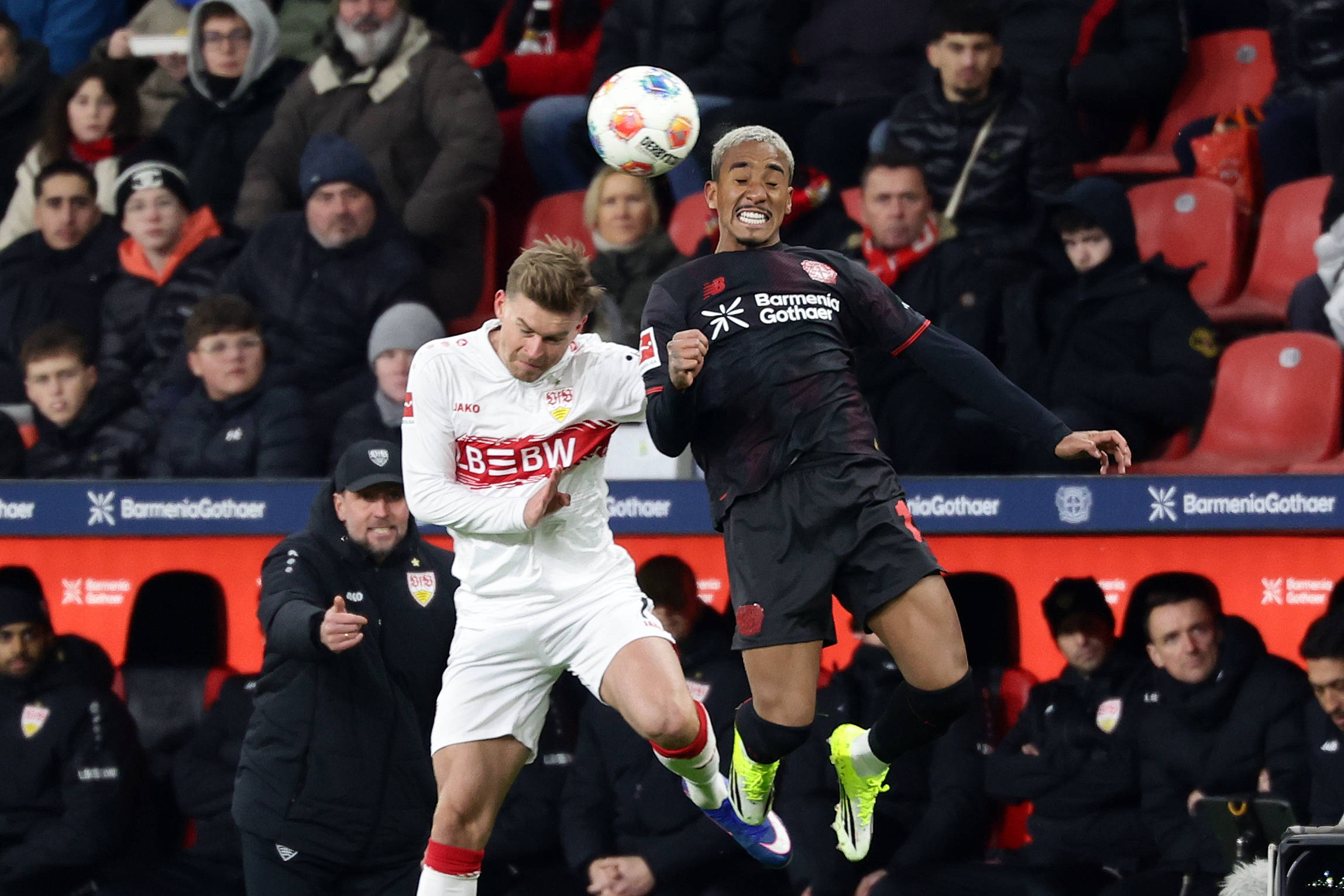 เมื่อวันที่ 10 มกราคม อาร์เธอร์ (ขวา) ของไบเออร์ เลเวอร์คูเซ่น และมิตเทลสตัดท์ ของสตุ๊ตการ์ท แย่งโหม่งลูกบอลระหว่างการแข่งขัน สำนักข่าวซินหัว (ภาพโดย Joachim Bivallés)